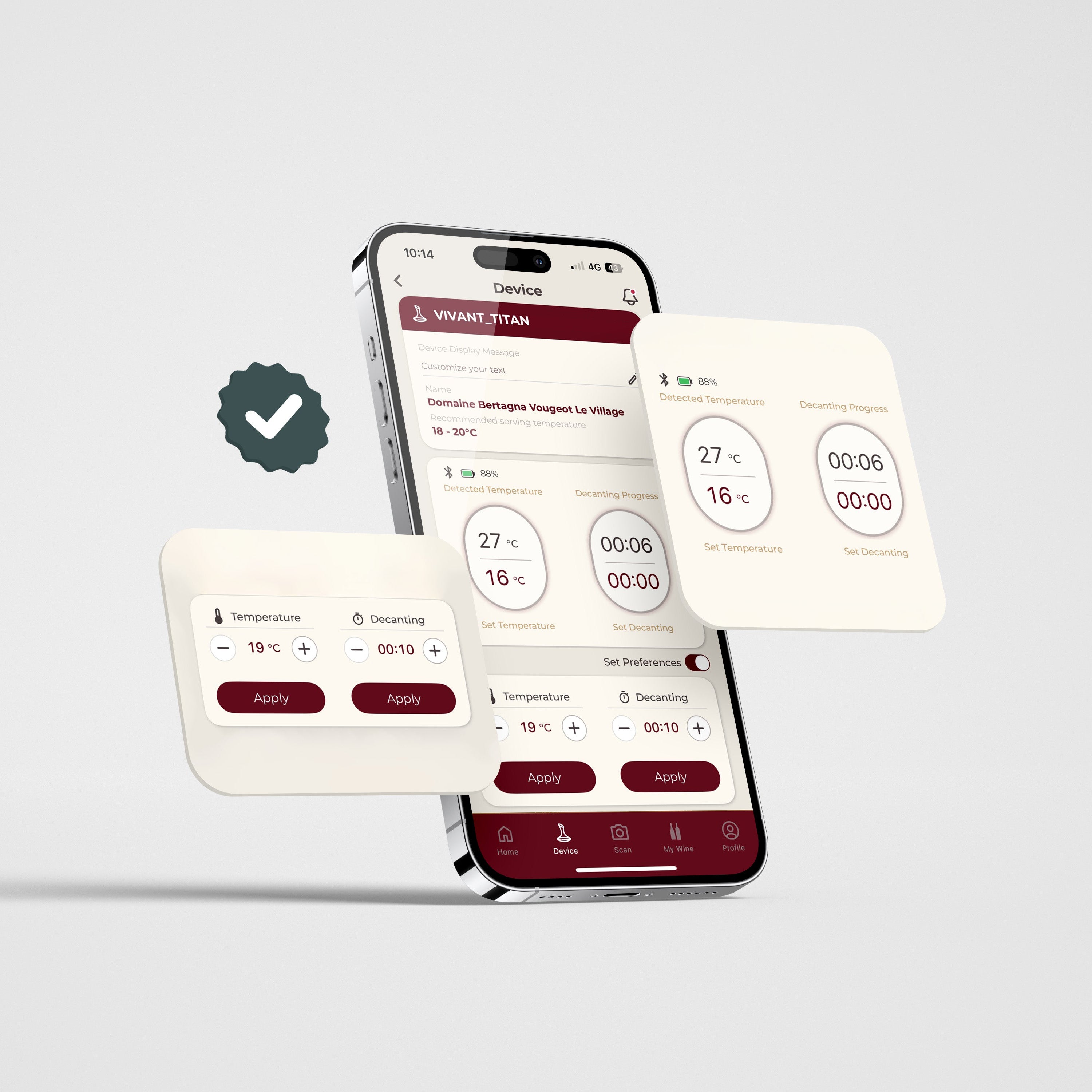 Remotely control your VIVANT Titan decanter chiller to achieve the perfect temperature and decanting time for any bottle.